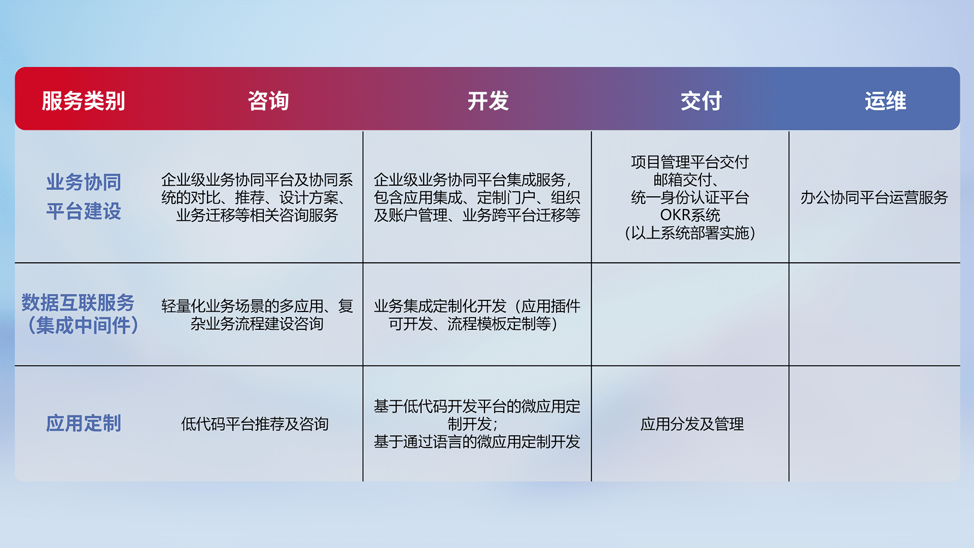 针对钉钉、、、、企微、、IDaas等平台级产品提供产品的规划、、方案、、、、交付、、、、定制化开发等服务,,实现如统一协同办公、、、智能客户服务、、、、混合会议管理、、智能数据查询、、等业务场景,,,实现数字化转型。。。