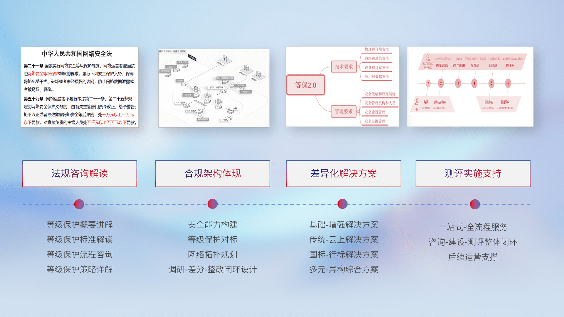 通过专业的法律咨询解读、、合规架构体现、、、差异化解决方案、、、、测试实施支持等服务,,,,为客户量身打造等保合规体系。。。